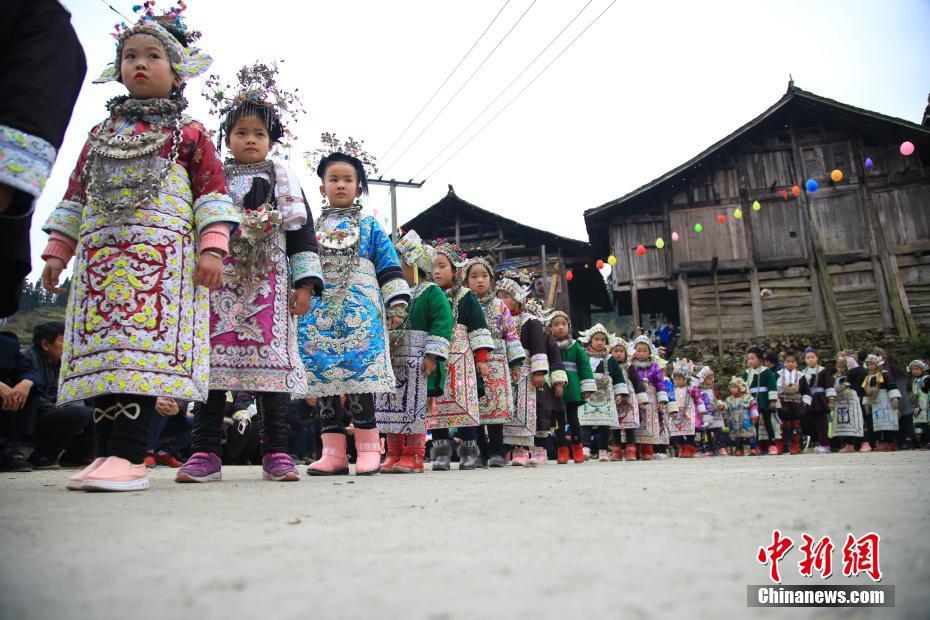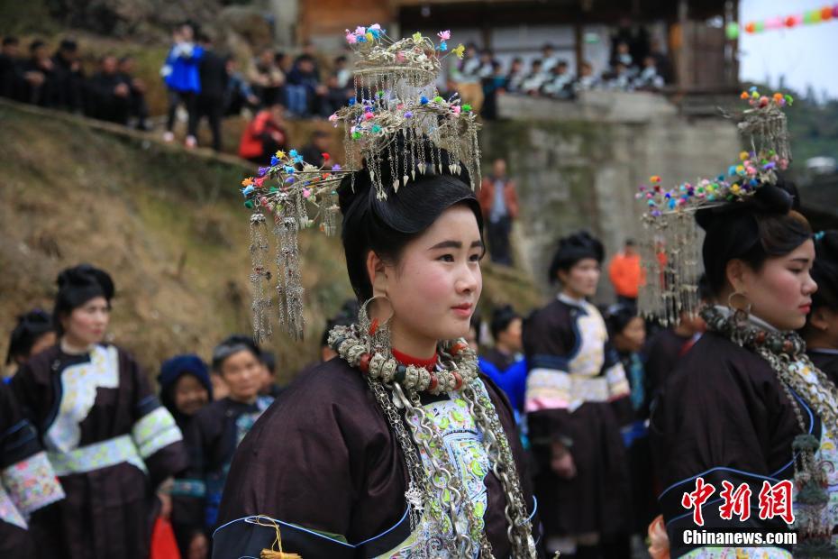 2月6日,贵州省榕江县仁里乡仁吉侗寨,姑娘们穿着盛装跳芦笙舞,庆祝新春佳节。当日,贵州省榕江县乐里镇乔勒侗寨和仁吉村田坝寨、大寨来到仁吉村富寨开展“吃相思”活动。“吃相思”是侗族地区节日期间或农闲时节,村与村、寨与寨之间相互走访的一种民俗活动。当地侗族青年在吃相思活动上,跳芦笙舞,秀盛装,寻找意中人。杨文舒摄