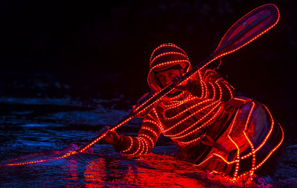 该视频拍摄于美国华盛顿州的白鲑鱼河。视频中,一名男子身穿带帽衫,浑身挂满了LED灯,在夜晚的水中划行。该男子浑身散发着或绿色或红色的灯光,在漆黑一片的水上划行,灯光晕染了周围的水花,看上去奇特绚丽。