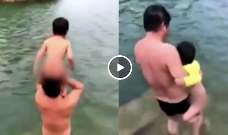 不料这名父亲竟然使出了狠招,转身将其上衣脱去丢在一旁,随后将赤裸的儿子举过头顶,双手托住儿子的屁屁,一把将其“发射”进了湖水中。