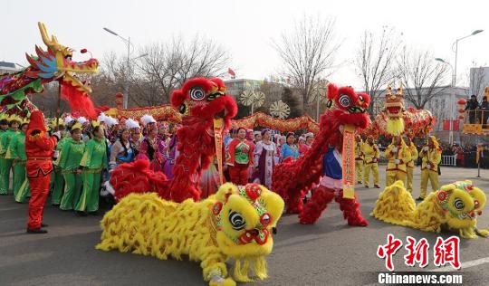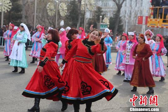 中新网新疆塔城2月11日电(记者闫文陆)新疆北部的塔城市11日举办元宵节社火巡游活动。作为新疆最知名的社火活动之一,塔城市的巡游不仅包括了秧歌、花车、舞狮、舞龙等传统社火活动,亦融入哈萨克、维吾尔等歌舞,展现多民族相融共生的包容文化。