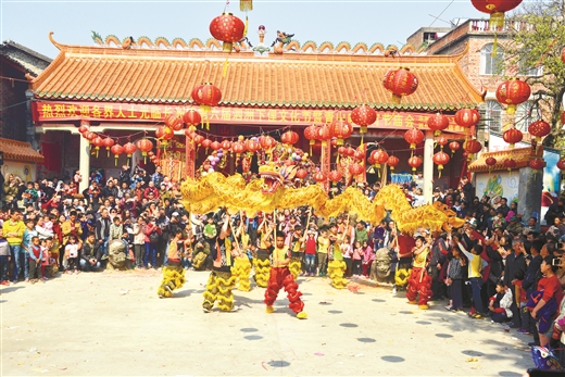 2月10-12日,梧州市长洲区长洲镇第六届下俚文化艺术节在泗洲村举行,独具特色的地方民俗活动吸引大批游客到场观赏。文化艺术节期间,村民自编自导的下俚歌舞在青山庙前舞台热闹开唱,“俚——下俚——”的古朴曲调,生活气息浓郁的歌词,展示了非物质文化遗产的魅力。游客还可以饶有兴致地举着长龙起舞,打着节拍听村民对歌、赛歌,三五好友一起坐下来品尝村民在青山庙内摆设的百家宴。